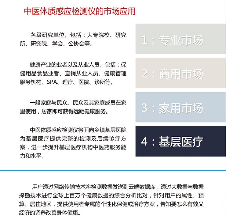 使用者可透过网络传输将检测数据发送到云端数据库,透过大数据与数据挖掘技术进行全球健康数据的综合分析比对,结合专家咨询系统,用户可在世界任何一个地方享有一流专家的健康咨询服务,藉以了解异常体质的形成原因以及改善健康的生活建议、商品信息或健康服务。