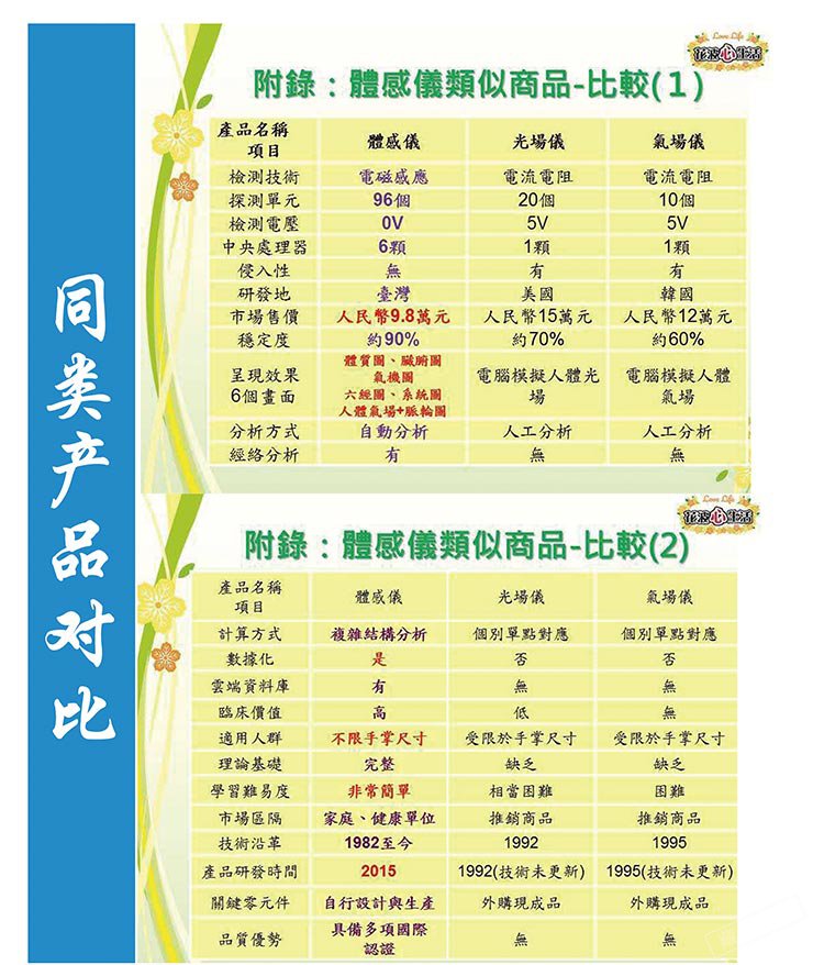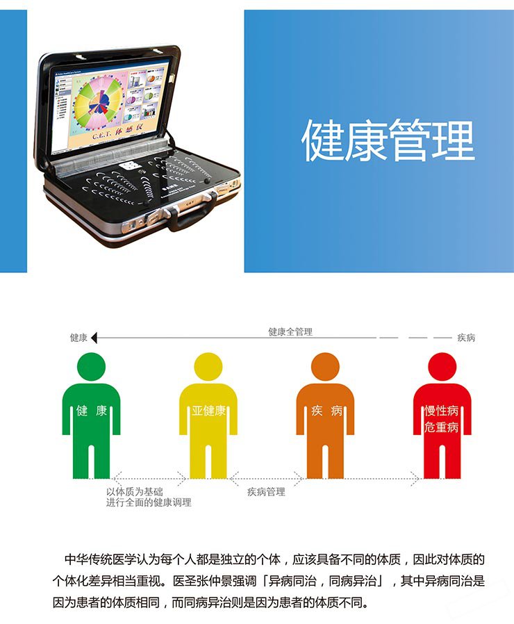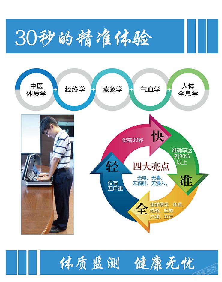 藉着“气”的数据来分析人体的体质,再将各种异常体质以百分比呈现其严重程度:检测的准确度高,使用简易,不需学习即可快速辨识自己的体质,具备简单,快速,全面,准确的优点。